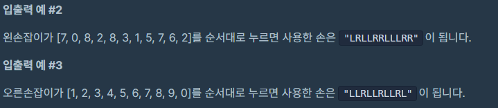 - 왼손 엄지손가락을 사용한 경우는 L, 오른손 엄지손가락을 사용한 경우는 R을 순서대로 이어붙여 문자열 형태로 return 해주세요.