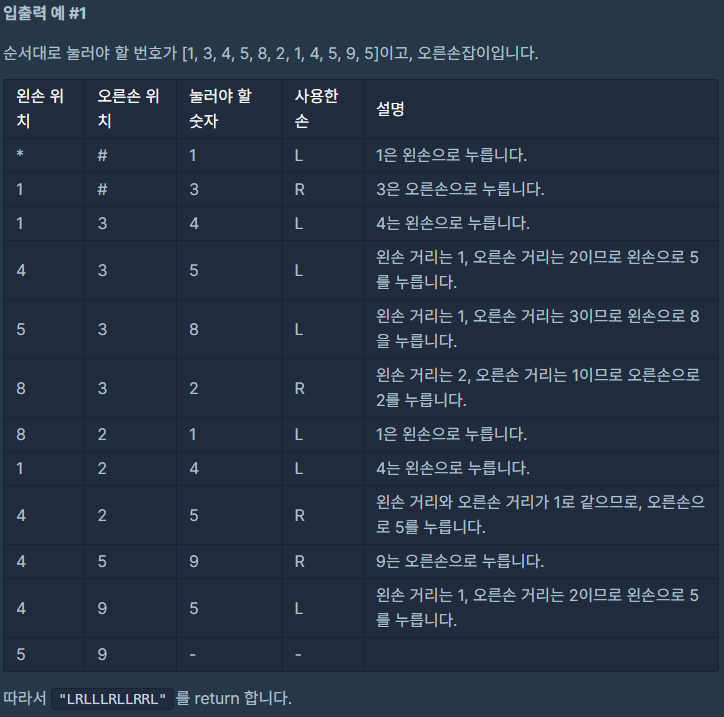 순서대로 누를 번호가 담긴 배열 numbers, 왼손잡이인지 오른손잡이인 지를 나타내는 문자열 hand가 매개변수로 주어질 때, 각 번호를 누른 엄지손가락이 왼손인 지 오른손인 지를 나타내는 연속된 문자열 형태로 return 하도록 solution 함수를 완성해주세요.