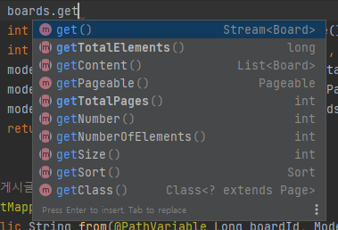 board.get까지만 치고 자동완성만 해봐도 현재 페이지 번호, 전체페이지 갯수, 전체 데이터 갯수등 제공을 다 해준다.