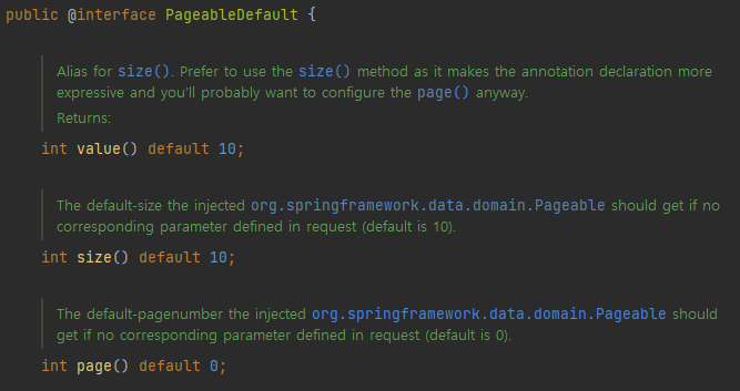 @PageableDefault 어노테이션은 page와 size등 따로 선언 하지 않을 경우 default값으로 전달해 준다.