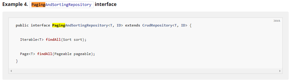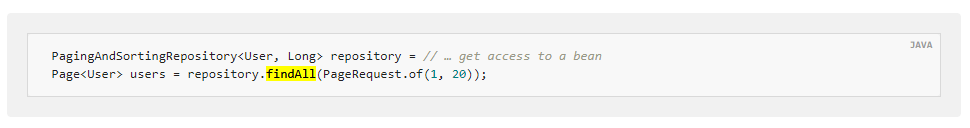 위의 예시 인터페이스를 보면 findAll 쿼리 메서드에 매개변수를 Pageable을 주고 Page타입으로 받을 수 있다.