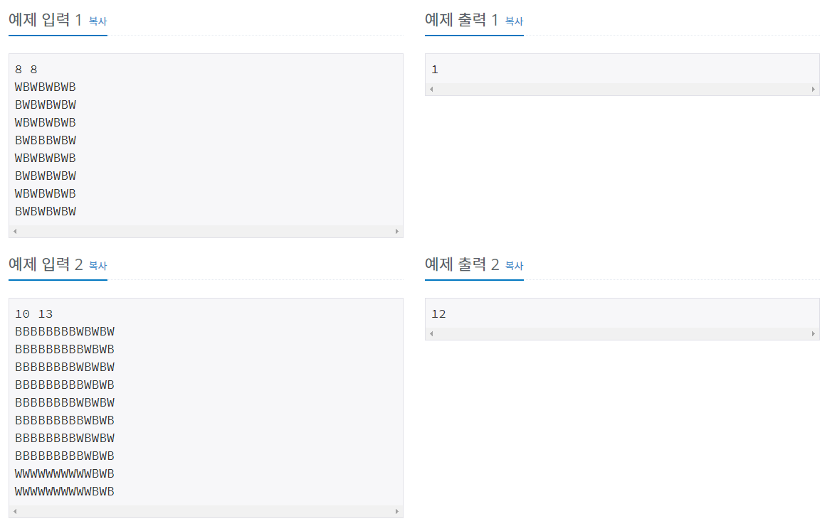 첫째 줄에 N과 M이 주어진다. N과 M은 8보다 크거나 같고, 50보다 작거나 같은 자연수이다. 둘째 줄부터 N개의 줄에는 보드의 각 행의 상태가 주어진다. B는 검은색이며, W는 흰색이다.