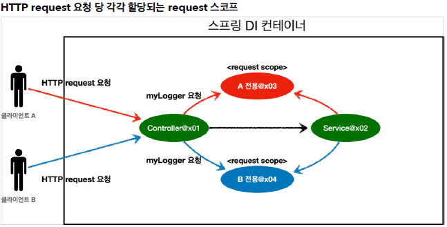 requset scope인 MyLogger 호출 시 각각 A, B 전용 객체가 생성됩니다.